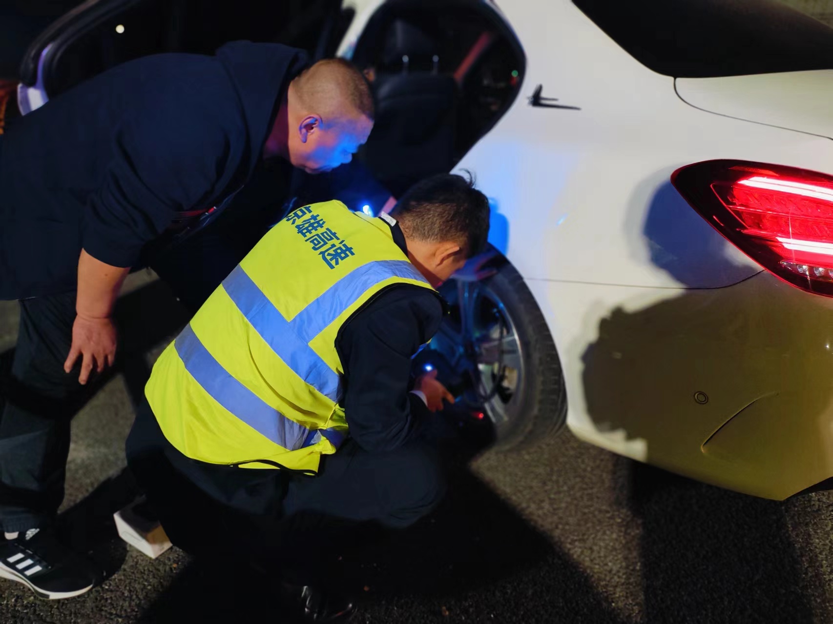 值班站长一边耐心地安抚司机的情绪,一边与当班班长在车辆后方摆放锥桶,以确保安全。随后,经过现场仔细查看发现车辆左后方轮胎被扎欠压严重。值班站长立刻安排后勤备岗人员取来便携无线充气泵,但由于轮胎破损严重导致打气无效,最终决定帮助司机联系附近的修车师傅并将其车辆牵引至修理厂。夜虽凉,但涿州东收费站工作人员的帮助恰似一股暖流,悄然流淌在司机的心中,驱散了他的不安与无助。
