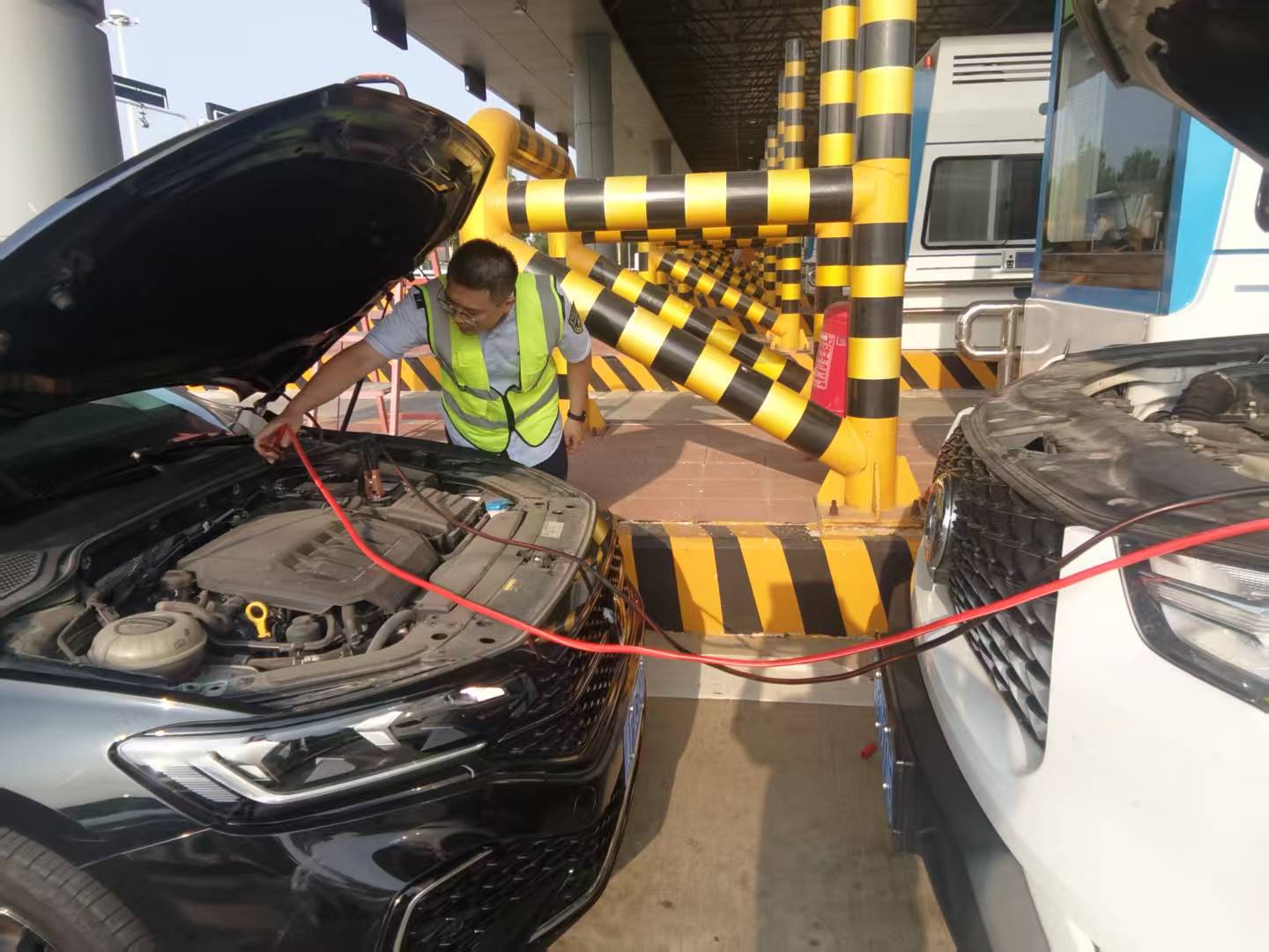 小张迅速对车辆进行检查,发现是电瓶亏电导致无法启动。他一边安抚司机:“您别着急,我们先帮您把车推到安全区域,再找车给您搭电。”一边联系站内同事一起帮忙。